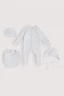 Комплект цвета ясного весеннего неба и мечтательных снов младенца. Цельнокроеный рукав с наружными швами предотвращает натирание и позволяет активно знакомиться с миром. Закрытые ножки и манжеты с царапками защищают кроху от прохлады. В комплекте предусмотрены слюнявчик на кнопках, отдельные царапки и чепчик с анатомическим кроем, исключающим трение и раздражение. 100% гипоаллергенный хлопок поддерживает естественный теплообмен, защищает от переохлаждения в +18 °C и перегрева в +24 °C. Чтобы нарядно упаковать комплект и ваши самые трогательные эмоции, мы предусмотрели фирменную коробочку с бумагой тишью.